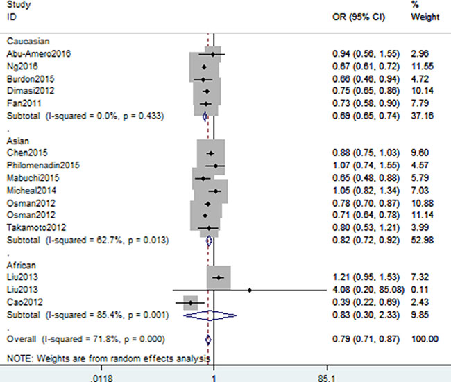 Figure 3: Stratification analysis of ethnicity shows odds ratio for the association between rs1063192 polymorphism and glaucoma risk (C vs. T).