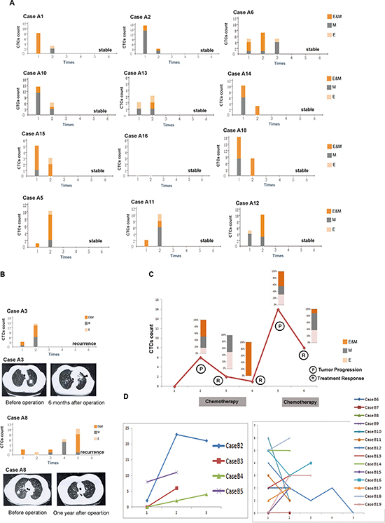 Figure 2: Longitudinal studies of EMT-CTCs in cohorts (A) and (B). A CTCs monitoring in the stable cases in cohort A. Case A1: 8 CTCs (prior to operation) to 3 CTCs(one month after operation). Case A2: 17 CTCs(prior to operation) to 3 CTCs(one month after operation). Case A6: 5 CTCs (prior to operation), 7 CTCs (four month after operation) to 5 CTCs(one year after operation).Case A10: 14 CTCs (prior to operation) to 6 CTCs(one moth after operation). Case A13: 2 CTCs (prior to operation) to 3 CTCs (one year after operation). Case A14: 10 CTCs(prior to operation) to 3 CTCs (one year after operation).Case A15: 5 CTCs(prior to operation) to 3 CTCs (one year after operation).Case A16: 0 CTC(prior to operation) to 0 CTC (one year after operation).Case A18: 18 CTCs(prior to operation) to 8 CTCs (one year after operation). Case A5: 1 CTCs(prior to operation) to 10 CTCs (one year after operation).Case A11: 2 CTCs(prior to operation) to 10 CTCs (eight months after operation).Case A12 5 CTCs(prior to operation) to 10 CTCs (one year after operation). (B) In case A3, CTCs remarkably increased in six months after operation compared with the preoperative CTCs , and chest CT and biopsy proved the local recurrence (arrow). In case A8, CTCs decreased in six months after the operation, however, increased gradually in eight months, ten months and one year after the operation, and chest CT and biopsy finally proved the local recurrence(arrow). (C) In case B1, CTCs count significantly increased from 0 (three months after operation) to 6 (six months after operation). Docetaxel & cisplatin were given to the patient, and CTCs count gradually decreased to 2 (after two cycles of chemotherapy) and 1 (after four cycles of chemotherapy). However, CTCs count increased to 16 and bone metastasis was proved, six months after finished chemotherapy. Therefore, two cycles of Pemetrexed & cisplatin plus Pamidronate Disodium were given to the patient, and CTCs count decreased to 8. (D) In cases B2-B5 with tumor progression, CTCs count significantly increased after operation. CTCs count and testing time (months after operation) of each case is present as follows. Case B2: 2 CTCs (eight months), 23 CTCs (thirteen months) to 21 CTCs (eighteen months). Case B3: 0 CTC (two months) to 6 CTCs (seven months).Case B4: 0 CTC (six months) , 2 CTCs (one year) to 4 CTCs (sixteen months. Case B5: 8 CTCs (48 months) to 11 CTCs (51 months) In cases B6-B19 with disease free survival, CTCs count significantly decreased in cases B10-B12, slightly increased in cases B8, B9, B13, B15, B17, B18 and B19, or remained stable in cases B6, B7, B14, and B16. CTCs count and testing time (months after operation) of each case is present as follows. Case B6: 2 (18 months) to 2 (22 months). Case B7: 0 (four months) to 0 (nine months). Case B8: 1(13 months) to 2 (21 months). Case B9: 0 (one month) to 2 (three months). Case B10: 6 (20 months) to 1 (24 months). Case B11: 3 (one month) to 1 (four months). Case B12: 4 (two months), 2 (five months), 1(eight months), 2(12 months), to 0 (18 months). Case B13: 2 (24 months) to 3 (36 months). Case B14: 5 (six months) to 5 (nine months). Case B15: 0 (one month) to 2 (six months). Case B16: 5(seven months) to 4 (22 months). Case B17: 1 (one month) to 2 (13 months). Case B18: 5 (13 months) to 6 (16 months). Case B19: 0 (19 months), 3 (26 months) to 3 (35 months).