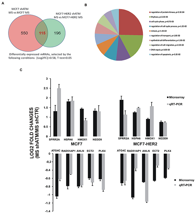 Figure 3: Gene expression profiling of mammospheres with or without interfering ATM expression. A. Number of differentially expressed mRNAs between mammospheres silenced for ATM and control mammospheres, obtained from three independent experiment performed with both targeting sequences for ATM (shATM#1 and shATM#3) and selected by the following conditions: |Log2FC|>0.58, T-test<0.05. In the Figure are shown the number of differentially expressed genes in mammospheres derived from MCF7 and from MCF7-HER2 cells. The intersection area encloses 115 common genes between mammospheres derived from both cell lines. B. Gene Ontology analysis of intersection set (115 mRNAs), obtained by the DAVID online tool. C. Microarray and qRT-PCR comparison. Log2 Fold Change of 9 genes between mammospheres shATM vs shCTR detected by microarray (black lines) were compared with those measured by qRT-PCR (grey lines). Positive values represent gene expression upregulation and negative values downregulation in mammospheres silenced for ATM gene (shATM) compared to control cells (shCTR). qRT-PCR results were normalized with TBP. Error bars indicate standard deviations of at least three independently performed experiments.