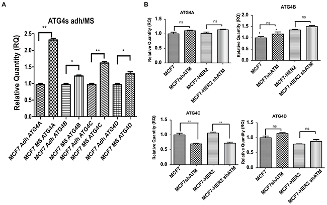 To further validate our hypothesis we downregulated ATG4C expression by specific RNA interference selective for this isoform (Figure 4A and Supplementary Figure 2C). Remarkably, we could show that the downregulation of ATG4C expression impairs mammospheres forming ability (Figure 4B), similarly to what previously observed upon ATM expression silencing (Figure 1A-1B). ATG4C is one on the four members of ATG4s protease family (including ATG4A, B, C and D); the family members share similar structure but have very well established different functions [25]. Recently, ATG4A has been identified as a modulator of mammospheres formation [18]. Accordingly, we could show that the expression of all ATG4 family members is enhanced, although to different extent, in mammospheres compared to adherent cells. Importantly ATG4A was the ATG4 family members most strongly up regulated in our models (Figure 5A). More interestingly, ATM does not affect the mRNA levels of ATG4A, B and D neither in MCF7 nor in MCF7-HER2 cells (Figure 5B) driving the conclusion that ATM selectively impinges on ATG4C expression.