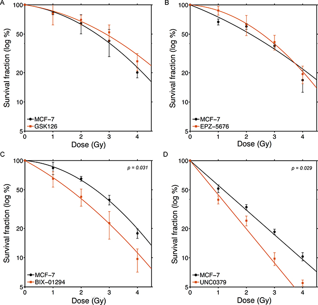 Figure 1: BIX-01294 and UNC0379 increase sensitivity of MCF-7 cells to ionizing radiation. MCF-7 cells were incubated with (A) GSK126 (5 μM), (B) EPZ-5676 (2.5 μM), (C) BIX-01294 (1 μM) or (D) UNC0379 (0.5 μM) for 4hr. Cells were then irradiated at the indicated dose. 20 hr post-irradiation cells were washed to remove inhibitors, fresh media added and cells allowed to grow for 12 days. Surviving colonies were stained with crystal violet to assess clonogenic cell survival. Results + SD (n = 3 biological replicates). Cell survival curves were fitted to a liner quadratic model. P-values for significant differences between slopes (calculated using the GraphPad Prism software package) shown where p < 0.05.