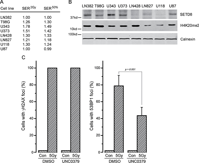 The ability of UNC0379 to sensitize GBM cell lines to radiation was examined next (Figure 2). Cell survival curves were fitted to a linear quadratic model to aid in interpretation. The original data is available in Supplementary Dataset 1. LN382 and U87 cell lines showed no increase in radiation sensitivity with UNC0379 treatment (Figure 2A and 2H), whereas the remaining cell lines displayed significant increases in radiosensitization (Figure 2B–2G). Western blot analysis confirmed that UNC0379 reduced H4K20me2 levels (Supplementary Figure 4C). To quantify this sensitization, we calculated the sensitizer enhancement ratio (SER) using 2 approaches (Figure 3A). The SER2Gy defines the fold increase in cell killing after inhibitor addition at 2Gy. In contrast, the SER50% defines the ratio of doses required to achieve 50% survival in the presence and absence of inhibitor. Both values give largely the same SER (Figure 3A) for each cell line. U343 (Figure 2C) and U373 (Figure 2D) displayed the most robust increase in SER with UNC0379, whereas the remaining cells showed increases in SER of less than 1.3 (T98G, LN428, LN827, U118) or had no sensitization (LN382 and U87). Glioblastoma cell lines therefore display a range of sensitivities to UNC0379, suggesting differences in the contribution of H4K20 methylation to DNA repair in this panel of cells. We therefore examined if the levels of SETD8 (the target of UNC0379) or H4K20me2 correlated with radiosensitization by UNC0379 (Figure 3B). Cells displayed a wide range of SETD8 levels (Figure 3B), but there was no clear relationship between SETD8 protein levels and radio-sensitization. For example, U343 and LN428 cells had widely different levels of SETD8 (Figure 3B) yet both were sensitized to radiation by SETD8 inhibition (Figure 2C and 2E). In addition, overall basal levels of H4K20me2 showed no direct link to either SETD8 (Figure 3B) or sensitization by UNC0379, suggesting that absolute levels of H4K20me2 are not related to overall radiation sensitivity. Finally, we examined how recruitment of 53BP1, which binds to damaged chromatin through dual interaction with both H4K20me2 and ubiquitinated H2A [7, 9], was affected by loss of H4K20me2. UNC0379 treatment did not alter phosphorylation of H2AX when measured as either number of cells with γH2AX foci (Figure 3C) or number of γH2AX foci per cell (Supplementary Figure 4A). However, recruitment of 53BP1 to DSBs was reduced by UNC0379 (Figure 3C), consistent with a reduction in H4K20me2 seen with UNC0379 treatment. However, significant levels of 53BP1 were still detected at DSBs in the UNC0379 treated cells (Figure 3C), despite the large reduction in H4K20me2 (Supplementary Figure 4C). The loss of H4K20me2 is therefore not sufficient to fully block 53BP1 loading at DSBs. However, given that 53BP1 also binds to ubiquitinated H2A, this residual 53BP1 binding may reflect interaction of 53BP1 with the ubiquitinated chromatin template.