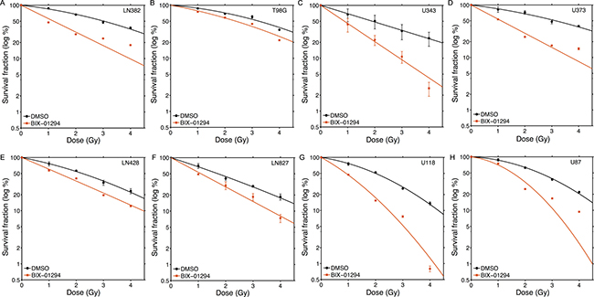 Figure 4: Increased radiosensitivity of glioblastoma cell lines following inhibition of G9a by BIX-01294. Glioblastoma cell lines (A) LN382; (B) T98G; (C) U343; (D) U373; (E) LN428; (F) LN827; (G) U118 and (H) U87 were incubated in BIX-01294 (1 μM) for 4 hr. Cells were then irradiated at the indicated dose. 20 hr post-irradiation cells were washed to remove inhibitor, fresh media added and cells allowed to grow for 12–15 days. Surviving colonies were stained with crystal violet to assess clonogenic cell survival. Results ± SD (n = 3 biological replicates). Cell survival curves were fitted to a liner quadratic model.