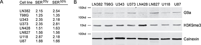 Figure 5: Levels of G9a and H3K9me3 do not correlate with radiosensitization by BIX-01294. (A) SER2Gy (fold increase in cell kill at 2Gy with UNC0379) and SER50% (fold decrease in dose required to kill 50% cells in presence of UNC0379) data derived from Figure 4. (B) Western blot analysis of G9a, H3K9me3 and calnexin (loading control) in the indicated cell lines.