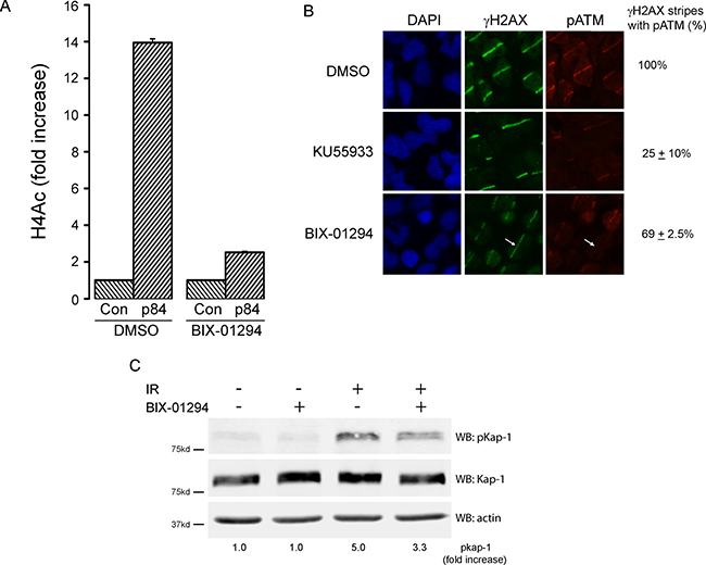 The increase in radiation sensitivity after BIX-01294 treatment indicates that H3K9me2/3 plays a key role in DSB repair. Previous work has shown that increased H3K9 can alter chromatin compaction at DSBs [3, 15, 56] and plays a critical role in activating both the Tip60 acetyltransferase [17] and the ATM kinase [20, 57, 58] after radiation. Tip60 binds directly to H3K9me2/3 at DSBs, and this interaction increases Tip60’s acetyltransferase and promotes acetylation of both histone H4 and the ATM kinase [17]. Further, treatment of cells with BIX-01294 reduces overall H3K9me3 levels (Supplementary Figure 4B). We therefore examined if inhibition of H3K9 methylation by BIX-01294 blocked activation of the Tip60 acetyltransferase after DNA damage. Tip60 acetylates histone H4 at DSBs [3], which promotes chromatin decondensation and DNA repair [21, 22]. H4 acetylation (H4Ac) was measured by creating a sequence-specific DSB with the p84-Zinc Finger Nuclease (p84-ZFN), following by chromatin immunoprecipitation (ChIP) using a ChIP-grade H4Ac antibody. In DMSO treated cells, the p84-ZFN DSB increased H4Ac on the adjacent chromatin (Figure 6A). Further, when cells were incubated with BIX-01294 (to deplete H3K9 methylation; Supplementary Figure 4B), H4Ac was largely blocked (Figure 6A). This is consistent with Tip60 activation at DSBs requiring interaction with H3K9me2/3 at adjacent DSBs. To further confirm this, we examined the ability of Tip60 to activate the ATM kinase. First, we used laser striping to create focused regions of DNA damage and monitored activation of ATM using an antibody which recognizes the phosphorylated, active form of ATM [59]. Immunofluorescent analysis using antibodies against γH2AX and pATM demonstrated increased phosphorylation of ATM and H2AX in the region of DNA damage (Figure 6B). pATM levels were significantly reduced after addition of the ATM inhibitor KU55933, with both a reduction in signal intensity at each stripe as well as loss of pATM from the majority of the damaged region, despite the presence of significant amounts of γH2AX. BIX-01294 also reduced the levels of pATM and the intensity of the γH2AX signal in the damaged region. In many cases, BIX-01294 cells retained γH2AX staining but lacked any detectable pATM signal (Figure 6B: arrows). This is consistent with BIX-01294 reducing H3K9me3 levels and thereby inhibiting Tip60-dependent activation of the ATM kinase. To further confirm this reduction in ATM activity, we examined the ability of ATM to phosphorylate one of its key targets, the KAP-1 repressor protein [60]. Figure 6C demonstrates that ATM-dependent phosphorylation of KAP-1 was reduced following addition of BIX-01294. These results are consistent with BIX-01294 blocking accumulation of H3K9me2/3 at DSBs, leading to failure to activate Tip60 and subsequent loss of Tip60-dependent acetylation of histone H4 and activation of ATM. Further, the reduction in ATM activation and loss of KAP-1 signal are similar to those reported following depletion of SUV39H1, which mediates H3K9me2/3 production at DSBs [15]. The ability of BIX-01294 to sensitize cells to radiation may therefore reflect loss of Tip60 activity and failure to activate key Tip60-dependent pathways, including ATM, which are required for DSB repair.