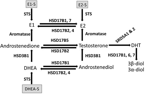 AKR: aldo-keto reductase; AP: activating protein; AR: androgen receptor; DHT: dihydrotestosterone; DHEA: Dehydroepiandrosterone; E1: estrone; E2: estradiol; ER: estrogen receptor; HSD17B: 17β-hydroxysteroid dehydrogenase; IDC: invasive ductal carcinoma; ILC: invasive lobular carcinoma; IL-1: interleukin 1; NAD: Nicotinamide adenine dinucleotide; PBRM: 3-(2-bromoethyl)-16β-(m-carbamoylbenzyl)-17β-hydroxy-1,3,5(10)-estratriene; PgR: progesterone receptor; SDR: short-chain dehydrogenase/reductase; SP: specificity protein; STS: steroid sulfatase; TNFα.