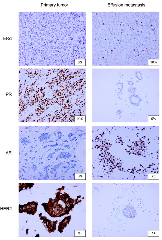 Figure 1: ERα, PR, AR and HER2 immunohistochemistry on paired primary breast tumors and pleural or peritoneal metastases. 20x magnification is used.