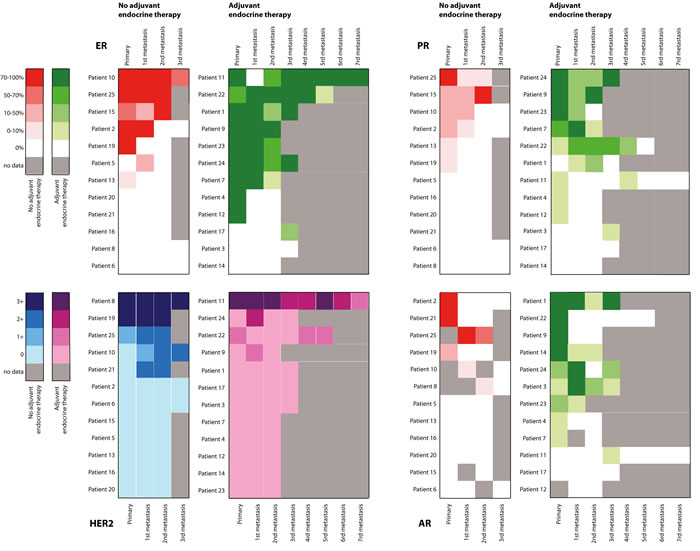 Figure 2: Heatmap of expression of ERα, PR, AR and HER2 in paired primary breast tumors and multiple pleural or peritoneal metastases per patient: progression over time. For ERα, PR and AR, green represents patients adjuvantly treated with endocrine therapy; red represents patients not adjuvantly treated with endocrine therapy. For HER2, purple represents patients adjuvantly treated with endocrine therapy; blue represents patients not adjuvantly treated with endocrine therapy.