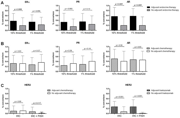 Patients adjuvantly treated with endocrine therapy showed more often conversion of ERα (p = 0.006 or p = 0.058 for the 10% or 1% thresholds for positivity, respectively) and AR (p = 0.001 or p < 0.001), but not of PR (p = 0.060 or p = 0.130; Figure 3). Adjuvant chemotherapy did not show such association (ERα: p = 0.835 or p = 0.271, PR: p = 0.383 or p = 0.156 and AR: p = 0.557 or p = 0.927 for the 10% or 1% thresholds for positivity, respectively).
