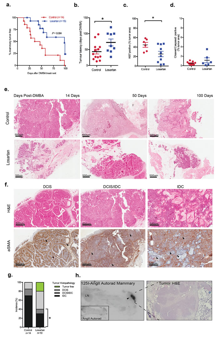 Figure 1: Inhibition of AT1R with Losartan decreases mammary tumor onset and progression associated with MPA and DMBA treatment. Nulliparous six-week-old female mice were implanted subcutaneously with MPA pellets and treated orally with DMBA. Losartan (600 mg/L) was administered in drinking water. a. Onset of mammary tumors in age-matched wildtype MPA/DMBA-treated mice control-treated (3% sucrose) or with AT1R blocker, Losartan. Data for panels are expressed as percentage of mice free of tumors (palpable and histological assessment) after last DMBA treatment (P = 0.004, Mantel Cox Log-Rank Test). b. Tumor latency, development of palpable tumors days post-DMBA administration, data point represents individual animal. Immunohistochemistry quantification of c. Ki67 and d. Cleaved Caspase 3 in control and Losartan-treated animals. Each data point represents individual tumor analysed; and immunostain is presented as a percentage of total tumour area including tumour-associated stroma e. Representative Haematoxylin/Eosin (H&E) stained histological sections of tumors from age-matched control and Losartan treated animals. f. Representative histological sections of mammary tumor stages identified including Ductal Carcinoma in situ (DCIS), mixed DCIS and invasive ductal carcinoma (DCIS/IDC) and IDC; H&E stained (top panel) and immunostained with a differentiation marker for cancer-associated fibroblasts, α Smooth Muscle Actin antibody (αSMA, bottom panel). Intact myoepithelial layer identified by αSMA is indicated (arrowheads) in well-differentiated DCIS, while loss of myoepithelial αSMA and gain of αSMA expression in the stroma (arrowheads) is indicated in DCIS/IDC and the poorly differentiated squamous IDC. g. Tumor histopathology quantified as % of tumors assessed. Difference in incidence of invasive tumors between the 2 groups is indicated (P = 0.03, Fisher’s Exact Test). Tumor-free animals are only observed in the Losartan group (green). h. Autoradiograph showing binding of I125-[Sar1, Ile8] Angiotensin II (I125AngII) to a section (unmagnified) of the inguinal mammary containing a DCIS lesion demonstrating strong AT1R expression. Insert: control tissue co-incubated with unlabeled AngII and I125AngII. H&E stained serial section of DCIS lesion at 20X magnification. Data are presented as mean +SEM, n = 10-15 animals per group. *P < 0.05, Mann Whitney Test unless otherwise stated.