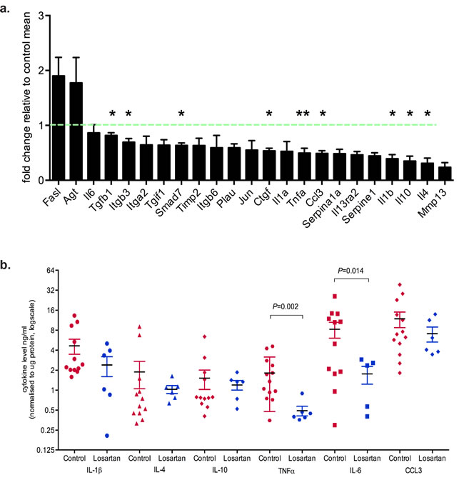 To identify differentially regulated genes downstream of the AT1R in neoplastic mammary glands, we used RT2 Profiler Arrays in glands harvested two weeks after the last DMBA administration. We observed down-regulation of several cytokine transcripts in neoplastic mammary glands of Losartan-treated animals (Figure 2a). Significant decreases were measured for TGFβ1, integrin β3, connective tissue growth factor (CTGF), tumor necrosis factor α (TNFα), Macrophage Inflammatory Protein 1α (MIP-1α, CCL3), interleukin (IL) 1, IL-4 and IL-10 mRNA (Figure 2a), all of which are implicated in inflammation, fibrosis and wound healing processes.