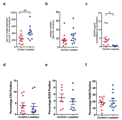 Figure 3: Losartan treatment increases peripheral blood vessel diameter and reduces VEGFA levels in tumors. a. Vessel diameter was measured for the blood vessels located at the tumor circumference, b. blood vessel density and c. VEGFA, a marker for angiogenesis, measured by ELISA in tumor lysates derived from control and Losartan-treated animals. Quantitation of immunohistochemistry stain of d. CD3, a marker for T cells, e. B220, a marker of B cells and f. the macrophage marker F4/80, in mammary tumour tissue of the two treatment groups. Data are presented as percentage of positively stained areas of the total tumour area including tumour-associated stromal regions; mean+SEM, P < 0.05, Mann Whitney Test.