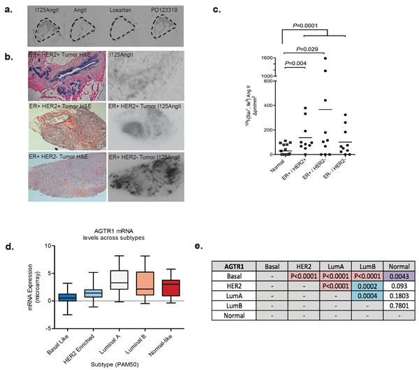 Figure 4: Expression of AT1R is increased in invasive breast cancer. a. Binding of 125I-[Sar1, Ile8] AngII to serial sections of a Grade II, ER+ve invasive tumor. Radioligand binding is displaced by unlabelled AngII or Losartan (AT1R blocker), but not PD123319 (AT2R blocker) indicating expression of AT1R. b. Left-hand panel: H&E-stained breast carcinoma sections; Right-hand panel: Corresponding 125I-[Sar1, Ile8] AngII binding in serial sections. c. Mean intensity of bound 125I-[Sar18] AngII /total area in tumor subtypes and matched normal tissue, n = 10; data points are combined from matched normal for each sub-type, n = 30. d. AGTR1 mRNA expression in TCGA breast invasive carcinoma, subtyped by the PAM50 molecular signature and e. P values highlighting statistically significant differences in AGTR1 expression between the PAM50 tumor subtypes (Mann Whitney Test). TCGA data was retrieved from cBioPortal.