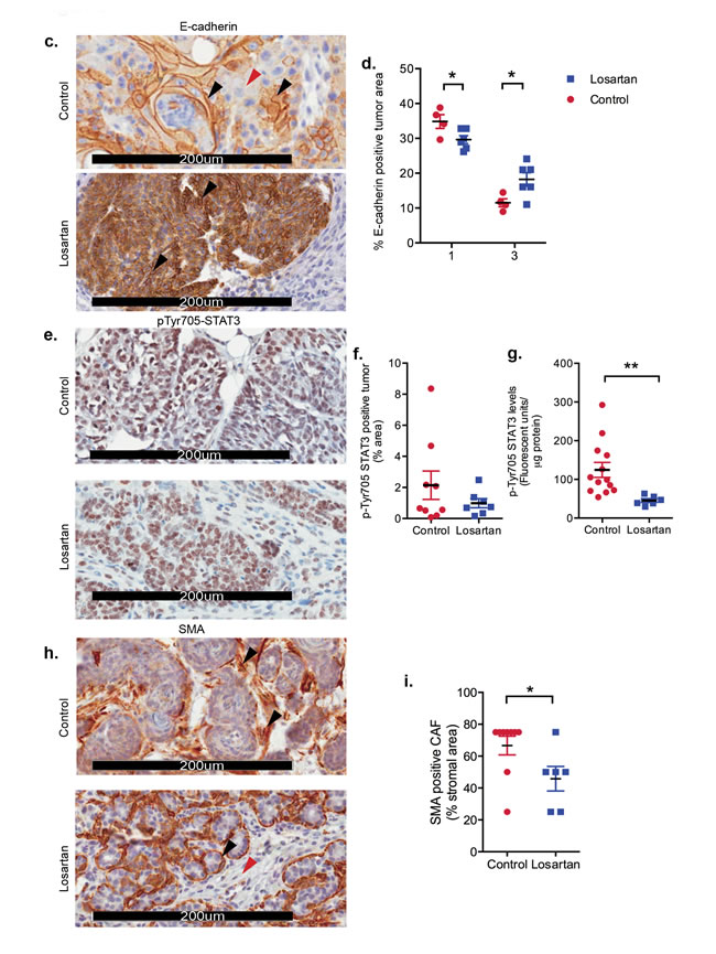 Therefore, we assessed E-cadherin expression as a marker for EMT [21] (Figure 2c). Strong membrane E-cadherin expression was observed in tumors from Losartan-treated mice compared to control mice (Figure 2c-2d, P < 0.05), suggesting a potential IL-6-mediated inhibition of tumor de-differentiation following ARB treatment. Strong evidence of a functional link between inflammation and breast cancer cell transformation has been shown to be mediated by the activation of NF-κB signalling, increased IL-6 and STAT3 phosphorylation by Iliopoulos and collegues [22]. We measured tumor phospho-Tyr705-STAT3 to determine whether the decrease in IL-6 levels resulted in the suppression of STAT3 activation. Nuclear pSTAT3, which localised to tumor epithelial cells and stroma in control mice (Figure 2e), showed reduced expression in Losartan-treated tumors, reflective of the decrease in IL-6 levels (Figure 2f). Additional validation by SureFire AlphaLISA also showed a reduction in pSTAT3 levels (Figure 2g, P < 0.05).