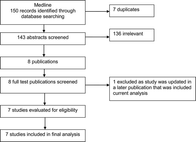 Figure 1 details the search strategy. We found seven non-comparative observational studies including 291 patients who received palliative RT for relief of local symptoms.[5, 6, 13-16]