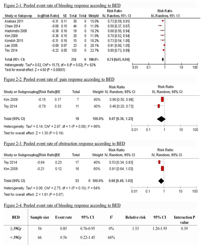 Only 122 patients were eligible for subgroup analyses as BED data were available. The overall pooled response rate for bleeding is 74% (95% CI 0.64-0.85. I2 = 68%) (Figure 2-1). There was no difference in response rate of bleeding between regimens with biological equivalent dose (BED) of ≥ 39Gy versus regimens with BED<39Gy (relative risk 1.53, 95%CI 1.20-1.95; p value =0.39) (Figure 2-4). Two studies suggested that local control was inferior for patients treated with BED regimens of <41Gy. [6, 15]