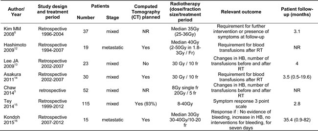 All patients received RT for palliation of local symptoms. Five studies included patients treated with chemoradiotherapy.[ 6, 12-14, 16] All patients in the studies had bleeding as the index symptom. Two studies included patients who presented with pain and obstruction.[6, 15] Five studies included patients with both locally advanced and metastatic disease. [5, 6, 13-15] Two studies included patient with metastatic disease only. [12, 16]