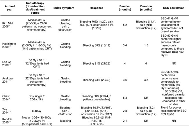 Common local symptoms that patients present with or develop include obstruction, bleeding or pain. The intervention options for relieving local symptoms include palliative radiotherapy (RT), palliative chemotherapy, gastric bypass surgery, palliative gastrectomy, and endoscopic stenting. The ideal treatment modality should be effective yet having minimal side effects. RT is a non invasive treatment for these local symptoms.[1-4] Interestingly, there is very scarce literature with regards to the tolerability and the efficacy of RT in palliating the local symptoms. Of debate is also the optimal dose fractionation regimen for effective symptom palliation. In patients with advanced disease, hypofractionated regimens have been increasingly used. Small case series have reported efficacy with hypofractionated regimens, with the added advantage of reduced overall treatment time.[5] Others have suggested that low BED (Biologically Effective Dose) regimens may not be adequate for palliation of obstruction and may be associated with poorer local control compared to higher BED regimens. [6] To date, there have been no published reviews summarizing the benefits of palliative RT for palliation of local symptoms.