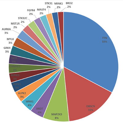 Figure 1: Genes with missense mutations. The pie chart shows kinase genes with the most number of missense mutations (with the denominator being the total number of missense mutations in all kinase genes).