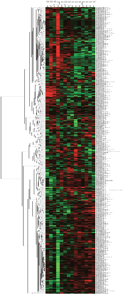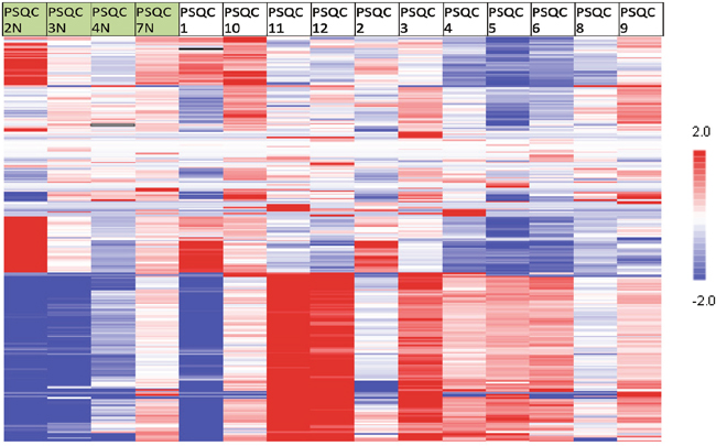 Figure 2: Kinase gene expression (NanoString) of normal and tumor samples. Gene expression heatmap showing unsupervised hierarchical kinase gene expression of the 3 normal sample columns on the left and 11 tumor samples on the right, with red showing overexpressed and green representing down-regulated gene expression; the heatmap shows the broad differences in kinase gene expression between normal and malignant tissue.