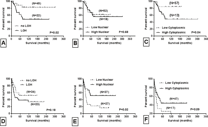 Fifty-five cases (55/209, 26%) and 77 cases (77/209, 37%) exhibited low SMAD4 immunohistochemical protein (IHC) expression in the cytoplasm and nucleus, respectively (Table 1). Kaplan-Meier survival analyses were conducted for nuclear and cytoplasmic protein expression for the entire study sample and by tumor stage. For the overall sample, there was a marginally statistically significant association between low nuclear SMAD4 IHC levels and poorer survival of these patients (log-rank, P = 0.07) (data not shown). There was, however, no association for patients with low SMAD4 IHC expression in cytoplasm (log-rank, P = 0.28) (data not shown). The 74 Stage II and 64 Stage III cases were then analyzed separately. For stage III patients, a low nuclear SMAD4 IHC level was significantly associated with shorter survival (log-rank, P = 0.02; Figure 1E). However, for Stage II patients, high cytoplasmic IHC expression of SMAD4 was associated with an increased risk of cancer-specific mortality (log-rank, P = 0.047; Figure 1C). These results suggest that, for stage III patients, low nuclear IHC expression of SMAD4 is a prognostic marker for shorter survival and recurrence. In contrast, a high cytoplasmic IHC level was associated with worse survival of stage II patients. There was no significant association between IHC expression of SMAD4 and age, sex, ethnicity, location, or histological grade (Table 1). However, there was a trend towards statistical significance for association between nuclear (p=0.08) and cytoplasmic (p=0.07) protein expression with tumor stage (Table 1).