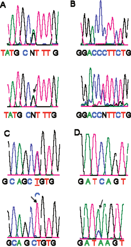 The resulting PCR products were sequenced by use of an ABI 3100 sequence detector with a set of primers covering the entire Smad4 coding region (exon 1 through 11; codons 1 through 552). The set included four forward primers and three reverse primers (Table 4). To detect gene mutations in Smad4, sequencing data were analyzed with DNA Star software.