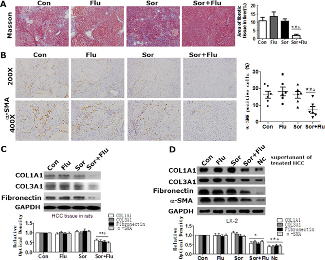 Figure 3: Effects of sorafenib and fluvastatin on liver fibrosis and HSCs activation. (A) Representative Masson trichrome staining of rat liver sections. The fibrotic area was quantified with a computerized grid. (B) IHC of α-SMA in rat liver (magnification, 200 × & 400 ×). (C) The protein levels of COL1A1, COL3A1, and Fibronectin in the liver tissues of rats were detected by Western blotting. (D) HepG2 cells were treated with 1 μM sorafenib, 1 μM fluvastatin, 1 μM sorafenib plus 1 μM fluvastatin, or the vehicle. LX-2 cells were cultured in the supernatants of HepG2 cells or control medium (Nc) for 48 h. Western blotting was used to detect the levels of COL1A1, COL3A1, Fibronectin and α-SMA in LX-2 cells. Values are expressed as the mean ± SEM of at least three independent experiments. *P < 0.05 vs. Con. #P < 0.05 vs. Flu. ΔP < 0.05 vs. Sor.