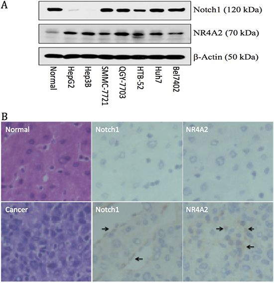 Figure 1: Up-regulation of Notch1 and NR4A2 in immortal HCC cell lines (A) and primary HCC tissues (B) in comparison with the normal controls. A. Western blot assay showed Notch1 was expressed highly in 5 out of 7 HCC cell lines, including Bel7402, Huh7, HTB-52, QGY-7721 and SMMC-7721, but not in Hep3B and HepG2, with NR4A2 being up-regulated in all 7 tested HCC cell lines. B. immuno-histochemistry assays confirmed the high expression of Notch1 and NR4A2 in primary HCC tissues with arrows pointing the positive expression, but not in normal tissues. The microscope images were shown at 40× magnification.