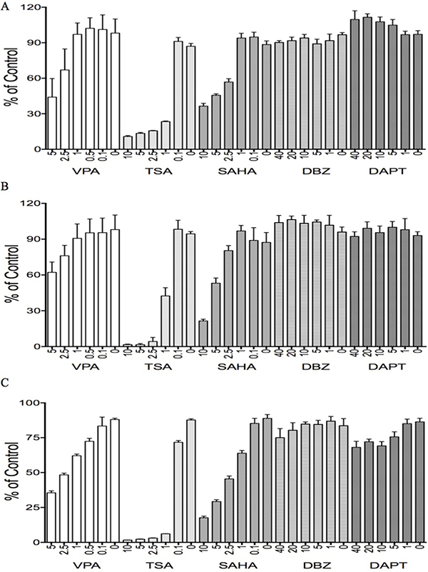 VPA displayed significant suppression in HCC and normal liver THLE2 cells in a dose-dependent manner, with the suppressive rates using VPA at 5 mM being 57% in HTB-52 cells (Figure 6A), 35% in HepG2 cells (Figure 6B) and 65% in THLE2 cells (Figure 6C). The two HDAC inhibitors TSA and SAHA showed more potent inhibitory activity in all HCC cells and in normal liver cells. In comparison with that, the two Notch inhibitors DBZ and DAPT had no effect in these cells (Figure 6).