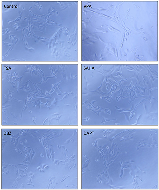 Figure 7: The effects of the tested compounds on cell morphological change in HTB-52 cells. A VPA, TSA and SAHA obviously induced cell morphological change, while DBZ and DAPT did not significantly. The microscope images were shown at 10× magnification.