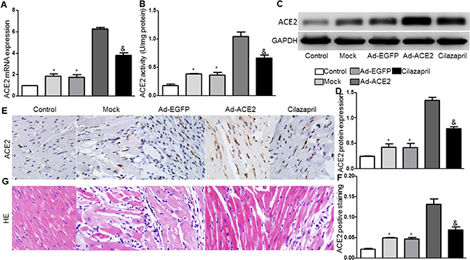 Figure 2: ACE2 expression and activity in 5 groups of rats after gene transfer. (A) ACE2 messenger ribonucleic acid (mRNA) expression was assayed by real time PCR in 5 groups of rats 2 weeks after gene transfer. (B) ACE2 activity. (C) Western blot analysis of the protein levels of ACE2 in homogenates of myocardium from five groups 2 weeks after gene transfer and (D) quantitative analysis of ACE2 protein expression in C. The blot is a representative of three blots from three independent experiments. (E) Immunohistochemistry (IHC) analysis of ACE2 of myocardium cross-section from each group rat 2 weeks after gene transfer and (F) quantitative analysis of ACE2 positive staining in E. Scale bar: 20 μm. *P < 0.05 vs. Control, Ad-ACE2 and Cilazapril. &P < 0.05 vs. Ad-ACE2. (G) Representative hematoxylin and eosin staining of myocardium cross-section in the five groups of rats 4 weeks after gene transfer. Scale bar: 20 μm. N is 8–15 in each group.