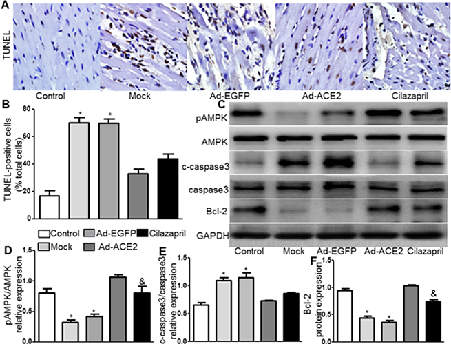 Figure 3: TUNEL staining and AMPK, caspase3, and Bcl-2 protein expression in five groups of rats 4 weeks after gene transfer. (A) Apoptosis is detected by TUNEL staining in myocardial tissue sections from each group rat 4 weeks after gene transfer. Representative TUNEL staining images are shown. scale bar: 20 μm. (B) Quantitative analysis of TUNEL-positive staining cells. (C) The levels of pAMPK, AMPK, c-caspase3, caspase3 and Bcl-2 protein in myocardium were determined by Western blot and (D–F) quantitative analysis of pAMPK/AMPK, c-caspase3/caspase3 and Bcl-2 protein in C. The blot is a representative of three blots from three independent experiments. N is 8–15 in each group. *P < 0.05 vs. Control, Ad-ACE2 and Cilazapril. &P < 0.05 vs. Ad-ACE2.