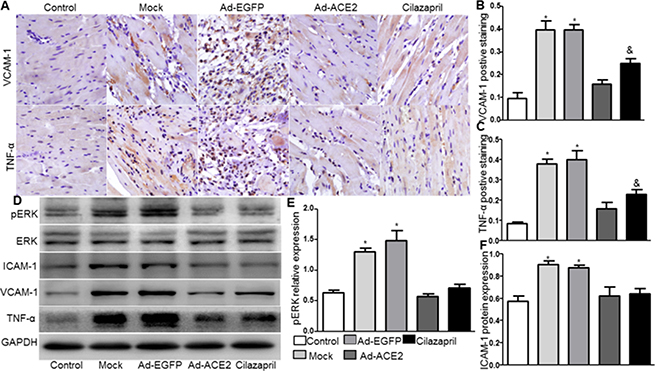 Figure 4: VCAM-1, TNF-α, ICAM-1 and ERK protein expression in five groups of rats 4 weeks after gene transfer. (A) IHC analysis of VCAM-1 and TNF-α of myocardium cross-section from each group and (B and C) quantitative analysis of the results in A. Scale bar: 20 μm. (D) The levels of ERK, ICAM-1, VCAM-1 and TNF-α protein in myocardium were determined by Western blot and (E and F) quantitative analysis of ERK and ICAM-1 protein in D. The blot is a representative of three blots from three independent experiments. N is 8–15 in each group. *P < 0.05 vs. Control, Ad-ACE2 and Cilazapril;&P < 0.05 vs. Ad-ACE2.