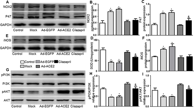 Figure 5: NOX2, P47, iNOS, PI3K, and AKT protein expression and SOD activity in five groups of rats 4 weeks after gene transfer. (A) The levels of NOX2 and P47 protein in myocardium were determined by Western blot and (B and C) quantitative analysis of NOX2 and P47 protein in A. (D) The levels of SOD activity in myocardium. (E) Western blotting analysis of the protein levels of iNOS in homogenates of myocardium from five group rats and (F) quantitative analysis of iNOS protein level. (G) The levels of pPI3K, PI3K, pAKT and AKT protein in myocardium were determined by Western blot and (H and I) quantitative analysis of pPI3K/PI3K, pAKT /AKT in F. The blot is a representative of three blots from three independent experiments. N is 8–15 in each group. *P < 0.05 vs. Control, Ad-ACE2and Cilazapril; &P < 0.05 vs. Ad-ACE2.