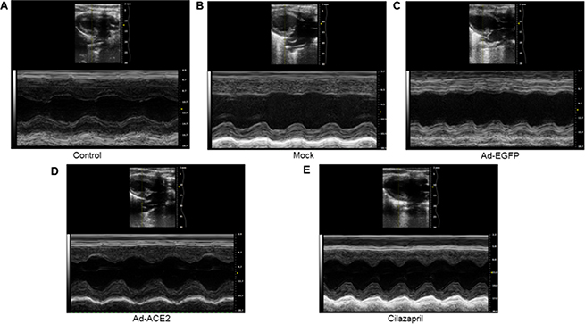As shown in Figure 6 and Table 1, LV end-systolic diameter and LVEDD were significantly decreased, whereas LVEF and FS were increased in the Ad-ACE2 and Cilazapril groups in comparison with the Mock and Ad-EGFP groups. In addition, LVEDD were higher, whereas LVEF and FS were lower in the Cilazapril group than in the Ad-ACE2 group. However, ACE2 and cilazapril had no significant effect on blood pressure and heart rate in doxorubicin-induced cardiomyopathy rats (Table 1).