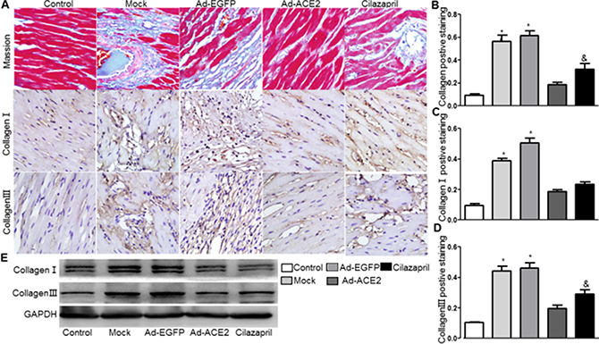 The result showed that the cardiac collagen deposition in Ad-ACE2 and Cilazapril groups was significantly lower than in the Ad-EGFP and Mock groups. Furthermore, the measurement in Ad-ACE2 group was significantly lower than in Cilazapril group. There was no statistical difference between the Ad-EGFP group and Mock group (Figure 7A and 7B). The protein expression levels of collagen I and III by immunohistochemical analysis in Ad-ACE2 and Cilazapril groups were significantly decreased compared with the Mock and Ad-EGFP groups. Furthermore, the collagen I protein expression in the Ad-ACE2 group was lower than in the Cilazapril group, while the protein expression level of collagen III had no statistically difference between the Ad-ACE2 and Cilazapril groups (Figure 7A, 7C and 7D). Immunohistochemical results were further verified by western blot analysis, a similar distribution in all 5 groups (Figure 7E).