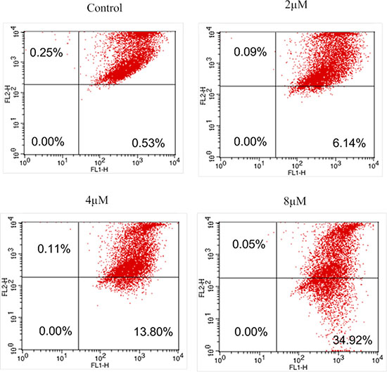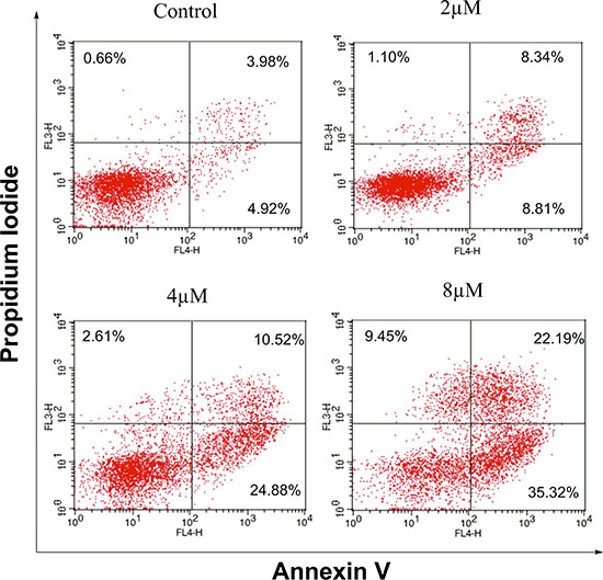 Apoptosis plays a central role in cancer treatment, since its induction in cancer cells is critical to a successful therapy [25, 26]. It is thus believed that apoptosis assay may provide important information to the preliminary investigation of the mode of action. The impact of IMB-1406 on the apoptosis of HepG2 cells was examined by Annexin V/PI staining followed by flow cytometry analysis. As shown in Figure 4, treatment of HepG2 cells with IMB-1406 for 72 h results in an increase of the apoptosis ratios from 8.9% (untreated vehicle control) to 17.15% (2 μM), 35.40% (4 μM) or 57.51% (8 μM), indicating that IMB-1406 is able to induce apoptotic cell death in HepG2 cells in a concentration-dependent manner.