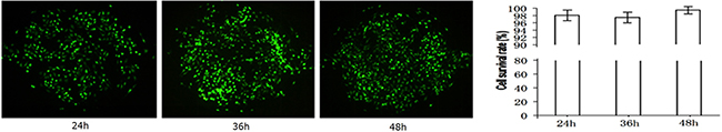 As we all known that the dye of Acridine orange (AO) and Ethidium bromide (EB) has the function on detecting the activity of cell. On the basis of these effects, Lung cancer cell line A549 was cultured 24h, 36h, 48h in the chip respectively. AO and EB were mixed in the dark according to ratio of 1: 1 (v/v). The mixture was injected into the area of cell culture in chip through precision syringe, staining 5 min at room temperature in the dark, and then, washed 3 times in phosphate-buffered saline (1×PBS). The chip was taken into the Inverted Fluorescence Microscope (Nikon ECLIPSE TI, Nikon, Japan) for photos after these complicated operations to calculate the Cell survival rate (%).