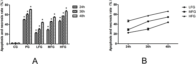 Figure 4: The pro-apoptotic effect of TFS on lung cancer cells (mean+/-SEM, n=3). Cell apoptosis profiles by Annexin V-FITC/PI double fluorescent assay of A549 cells through flow cytometry. In Figure 5A, it is the histogram of Apoptosis and necrosis rate in each group. They all treated with TFS and Cisplatin in different concentrations for 36 h. In Figure 5B, I represents CG, II represents LFG, III represents MFG, IV represents HFG, V represents PG. *compared with CG, P<0.05 as significant difference.