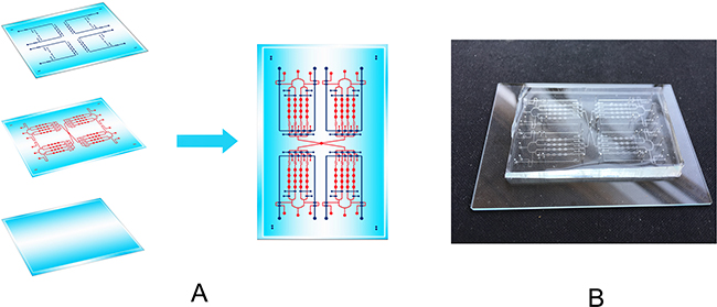 Figure 8: The design of a cell culture microfluidic chip. (A) The schematic design of the microfluidic chip with VCL and cell culture chambers. The channel of blue was the VCL including GLs and LLs, the red channels was FCL, the function of the ellipses was for cells growth. (B) The pictorial diagram of the chip.