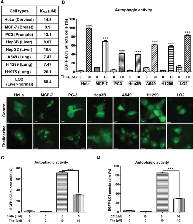 Figure 2: Thalidezine shows specific cancer cells cytotoxicity and induces autophagy. (A) Thalidezine exhibits specific cell cytotoxicity toward a panel of cancer and normal cells. Mean IC50 values were shown in the table. (B) Thalidezine induces EGFP-LC3 puncta formation in HeLa, MCF-7, PC3, Hep3B, A549, H1299 cancer cells and LO2 normal hepatocytes (lower panel). Cells were treated with DMSO or 10 μM of thalidezine for 24 h. Percentage of cells with EGFP-LC3 puncta formation quantification was indicated as upper panel. (C & D) Autophagic inhibitor 3-MA and AMPK inhibitor CC respectively abolish thalidezine-mediated autophagy. HeLa cells transiently transfected with EGFP-LC3 plasmid were treated with DMSO or 10 μM thalidezine (Tha) with or without 3-MA (5 mM), and with or without CC (5 μM) for 4h. Bar charts quantification of cells with increased EGFP-LC3 puncta formation were shown. Representative fluorescence microscopy images are shown in Supplementary Figure 2B & 2C. ***, P ≤ 0.001. Data were mean value ± S.D of three independent experiments.