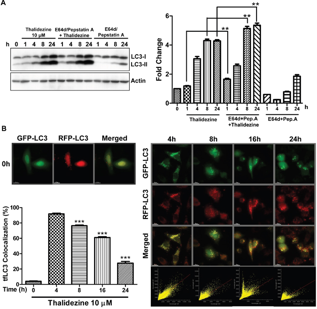Figure 3: Thalidezine induces autophagic flux in HeLa cells. (A) Thalidezine induces LC3-II conversion in the presence of lysosomal inhibitors. HeLa cells were treated with 10 μM of thalidezine in the presence or absence of 10 μg/mL lysosomal protease inhibitors (E64d and pepstatin A) for 24 h. Immunoblot for LC3-I, LC3-II, and β-actin detection (left). LC3 conversion was expressed as fold change relative to the DMSO-treated negative control (right). Uncropped blots images are shown in Supplementary Figure 4C. (B) tfLC3 fluorescence detection pattern of thalidezine. HeLa cells were transfected with mRFP-GFP-LC3 plasmids and treated with 10 μM of thalidezine (Tha) for 0-24 h. Representative micrographs of cells with GFP-LC3 puncta (green channel), mRFP puncta (red channel), and merge images are shown (upper-left and right panel). Scale bar = 15 μm, 60X. Each correlation plot was derived from the field shown in the fluorescence image (lower-right panel). Histogram represented the quantification of the percentage of colocalization between mRFP and GFP signal (lower-left panel). **, P ≤ 0.01; ***, P ≤ 0.001. Data were mean value ± S.D of at least three independent experiments.