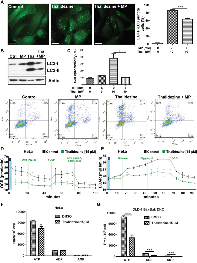 Figure 4: Thalidezine suppresses cancer cell energy metabolism. (A) Methyl pyruvate suppresses the thalidezine-mediated autophagic effect in cancer cells. HeLa cells were treated with 10 μM of thalidezine (Tha) with or without 5 mM of methyl pyruvate (MP) for 24 h. Representative micrographs of autophagic cells and cell percentage with EGFP-LC3 puncta formation quantification. Scale bar = 10 μm, 60X. (B) Methyl pyruvate abolishes the thalidezine-mediated LC3-II conversion. Immunoblot for LC3-I, LC3-II, and β-actin detection (Uncropped blots images, Supplementary Figure 4B). (C) Methyl pyruvate abrogates thalidezine-mediated cell death. Annexin V stain flow cytometry analysis (lower panel) and percentage of cell death quantification (upper panel). (D) Thalidezine inhibits mitochondrial respiration and oxygen consumption rate (OCR). (E) Thalidezine inhibits glycolysis and extracellular acidification rate (ECAR). HeLa cells were treated with 15 μM of thalidezine for 24 h and then subjected to seahorse analysis using OCR and ECAR assay kits. (F & G) Thalidezine decreases the ATP production in HeLa and DLD-1 BAX-BAK DKO colon cancer cells. *, P ≤ 0.05; **, P ≤ 0.01; ***, P ≤ 0.001. Data were mean value ± S.D of three independent experiments.