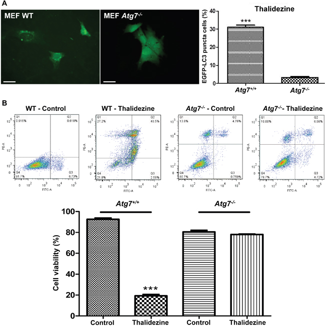 Figure 5: Thalidezine induces autophagic cell death in Atg7-dependent manner. (A) Thalidezine induces autophagy EGFP-LC3 puncta in Atg7+/+ WT MEF cells. Both Atg7+/+ WT and Atg7-/- deficient MEF cells were treated with DMSO (Control) or 10 μM of thalidezine (Tha) for 24 h prior to immunofluorescence imaging. Scale bar = 10 μm, 60X. Bar chart quantification of cells with EGFP-LC3 puncta formation is shown in the right panel. (B) Thalidezine induces cell death in Atg7+/+ WT MEF cells. Annexin V stain flow cytometry analysis (upper panel) and percentage of cell viability quantification (lower panel). ***, P ≤ 0.001. Data were mean value ± S.D of three independent experiments.