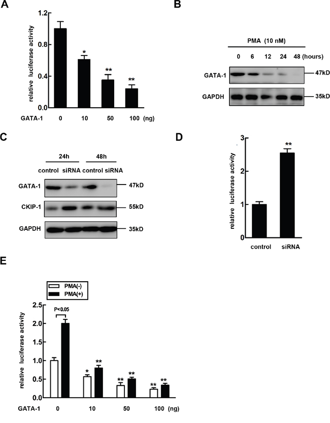 Figure 2: Overexpression of GATA-1 reverses PMA-mediated CKIP-1 expression induction. A. pGL3-(-3878/+128) plasmids were cotransfected with different dose of pcDNA3.1-GATA-1 (Myc) as indicated. The assays for relative luciferase activity were performed 24 h post-transfection. Data represent means ±SEM. B. K562 cells were treated with 10 nM PMA for the indicated time. Then total lysates were prepared for the analysis of GATA-1 expression by western blot. GAPDH was used as loading control. C. A negative control siRNA or GATA-1-specific siRNA was transfected into K562 cells. The GATA-1 and CKIP-1 expression levels were detected by western blot. GAPDH was used as loading control. D. pGL3-(-3878/+128) plasmids were cotransfected with a negative control siRNA or GATA-1-specific siRNA into K562 cells and luciferase activity assays were performed. Data represent means ±SEM. E. pGL3-(-3878/+128) plasmids were cotransfected into K562 cells with different dose of GATA-1 expression vector in the absence or presence of PMA as indicated and relative luciferase activities were performed. All transfections were normalized according to Renilla-luciferase activity. Data represent means ±SEM.