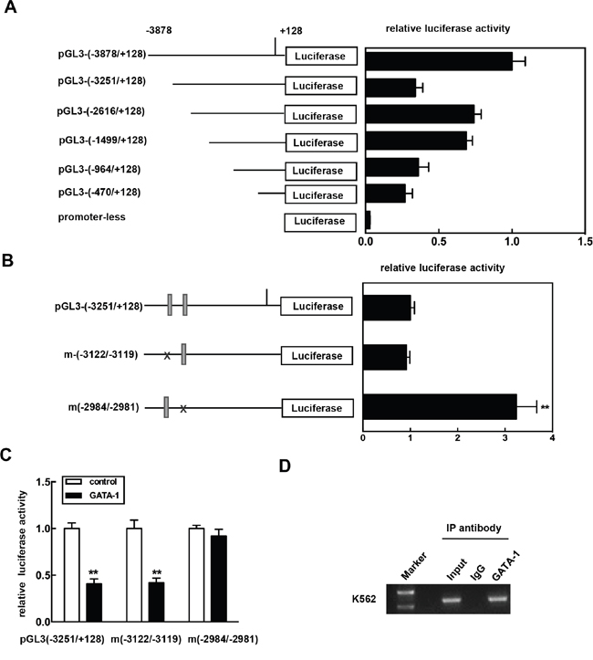 Figure 3: Identification of the functional GATA-1 element in the CKIP-1 promoter. A. Schematic diagram of reporter constructs consisting of truncated CKIP-1 promoter fragments. Histogram shows the relative luciferase activity for each construct in K562 cells. Data represent means ±SEM. B. Reporter constructs showing the presence of wild-type or mutant GATA-1 cis element at -3122/-3119 and -2984/-2981 in the CKIP-1 promoter. Histogram shows the relative luciferase activity for each construct in K562 cells. Data represent means ±SEM. C. pGL3-(-3251/+128) or the mutants m(-3122/-3119) and m(-2984/-2981) was transiently cotransfected with GATA-1 expression vector pcDNA3.1-GATA-1 (Myc) into HEK 293T cells. The assays for relative luciferase activity were performed 24 h post-transfection. All transfections were normalized according to Renilla-luciferase activity. Data represent means ±SEM. D. Chromatin immunoprecipitation assay was carried out as described in Materials and methods. After immunoprecipitation with anti-GATA-1 antibody, DNA was purified. PCR was performed using the primers located in the region from -3010 to -2789 (P-3010/-2789). For specificity control, samples treated with unrelated IgG are also shown.