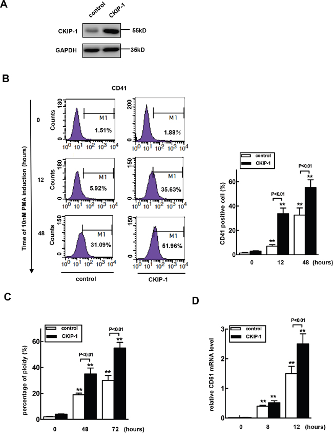 To establish the cause and effect relationship between upregulation of CKIP-1 and megakaryocytic differentiation, we constructed a CKIP-1 stably expressed K562 cell line (K562-CKIP-1). CKIP-1 expression levels were confirmed by western blot (Figure 4A). K562-CKIP-1 cells and control cells were treated with PMA for indicated lengths of time to undergo megakaryocytic differentiation and CD41 was used as a marker of mature megakaryocytes. As shown in Figure 4B, the relative numbers of CD41+ cells increased to 7% at 12h and to about 33% at 48h after PMA treatment in control cells. In K562-CKIP-1 cells, the relative numbers of CD41+ cells increased to 34% at 12h and 55% at 48h after PMA treatment. We performed ploidy analysis by flow cytometry after PMA induction and found that the percentage of 4N cells was increased in both control cells and K562-CKIP-1 cells, and the relative number of 4N cells after PMA treatment in K562-CKIP-1 cells was higher (Figure 4C). Similar results were observed that CD61 (a specific megakaryocyte marker) mRNA levels were also evaluated in K562-CKIP-1 cells than in control cells (Figure 4D). These results strongly indicated that overexpression of CKIP-1 was sufficient to induce the early events of megakaryocytic differentiation in K562 cells.