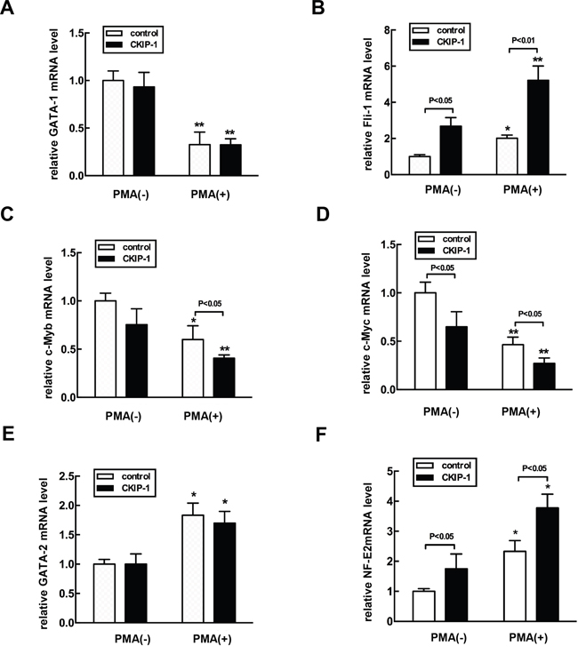 Figure 6: Alteration of expression levels of hematopoietic transcription factors in CKIP-1-overexpressing K562 cells. A-F. K562-CKIP-1 cells and control cells were treated with 10 nM PMA for 72 hours. Then total RNA was extracted. Gene expression was analyzed by real-time PCR with GATA-1, Fli-1-, c-Myb-, c-Myc-, GATA-2-, and NE-F2-specific primers as described in Supplementary Table 1. Data are expressed as fold induction relative to cells at day 0 and normalized to GAPDH mRNA. Data represent means ±SEM.