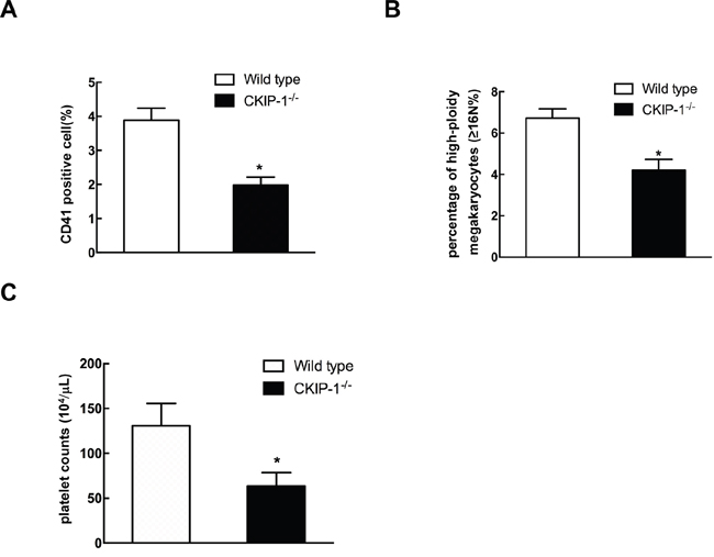 In order to further analyze the role of CKIP-1 during megakaryocytes development in vivo, we examined the expression of surface markers CD41 in CKIP-1 deficient mice. Flow cytometric analysis of bone marrow cells harvested from femurs of CKIP-1-/- mice showed a decrease in CD41-positive cells when compared to wild-type controls (Figure 7A). Furthermore, in vivo megakaryocyte ploidy in bone marrow from CKIP-1-/- mice was statistically significant decreased when compared to bone marrow from wild-type littermates (Figure 7B). Circulating platelet levels in CKIP-1-/- mice were decreased when compared with wild-type mice (Figure 7C), which maybe a result of reduced number of megakaryocytes.