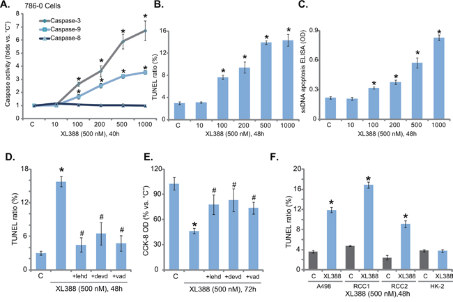 Figure 2: XL388 activates apoptosis in RCC cells. 786-0 or A498 RCC cells, the primary human RCC cells ( “RCC1 and RCC2”) or the HK-2 cells were stimulated with applied concentration of XL388, cells were further cultured in the conditional medium for applied time, cell apoptosis was tested by the caspase activity assay A., TUNEL staining assay B and F. and the ssDNA ELISA assay C. 786-0 cells were pre-treated for 30 min with 50 μM of the caspase-9 inhibitor z-LEHD-CHO (“+lehd”), the caspase-3 inhibitor z-DEVD-CHO (“+devd”) or the pan caspase inhibitor z-VAD-CHO (“+vad”), followed by XL388 (500 nM) treatment, cell apoptosis and viability were tested by the TUNEL assay D. and the CCK-8 assay E., respectively. For each assay, n=5. Experiments in this figure were repeated three times, and similar results were obtained. *p < 0.05 vs. “C” group. #p < 0.05 vs. “XL388” only group (D and E).